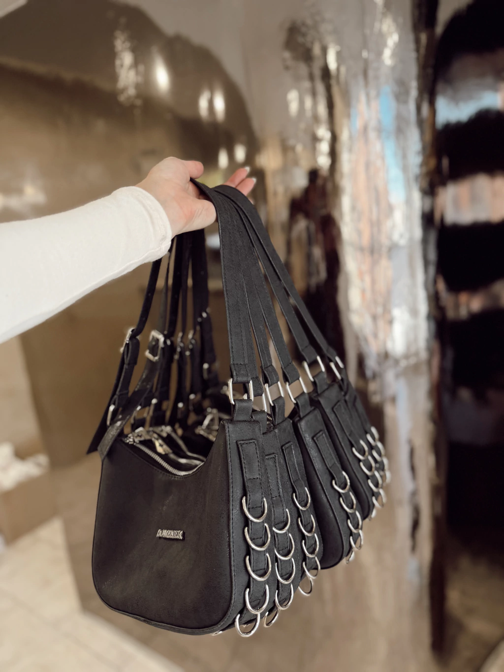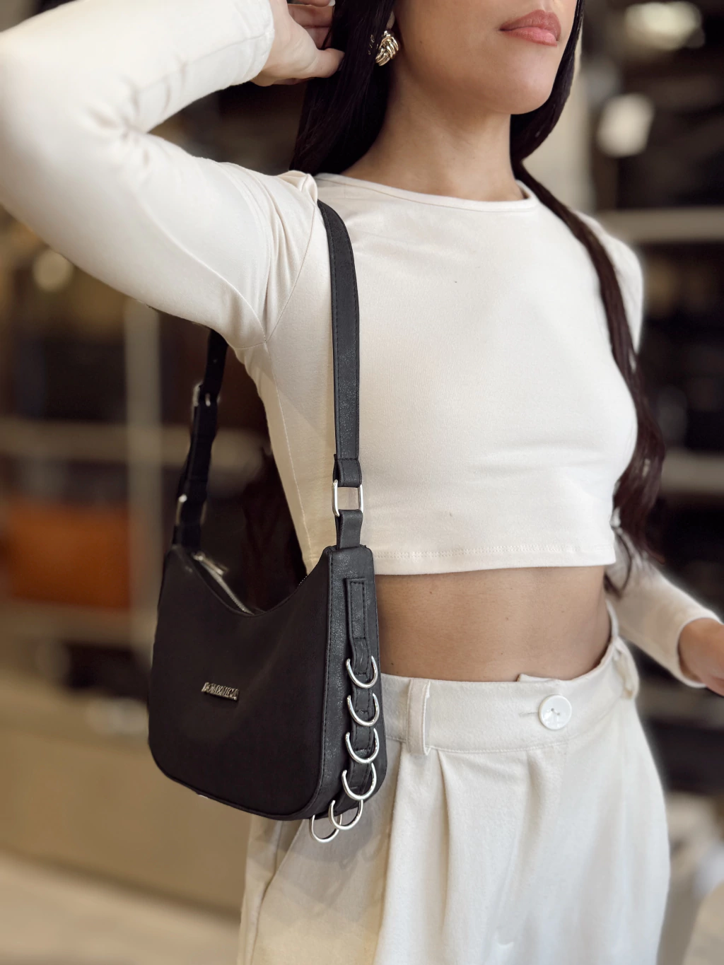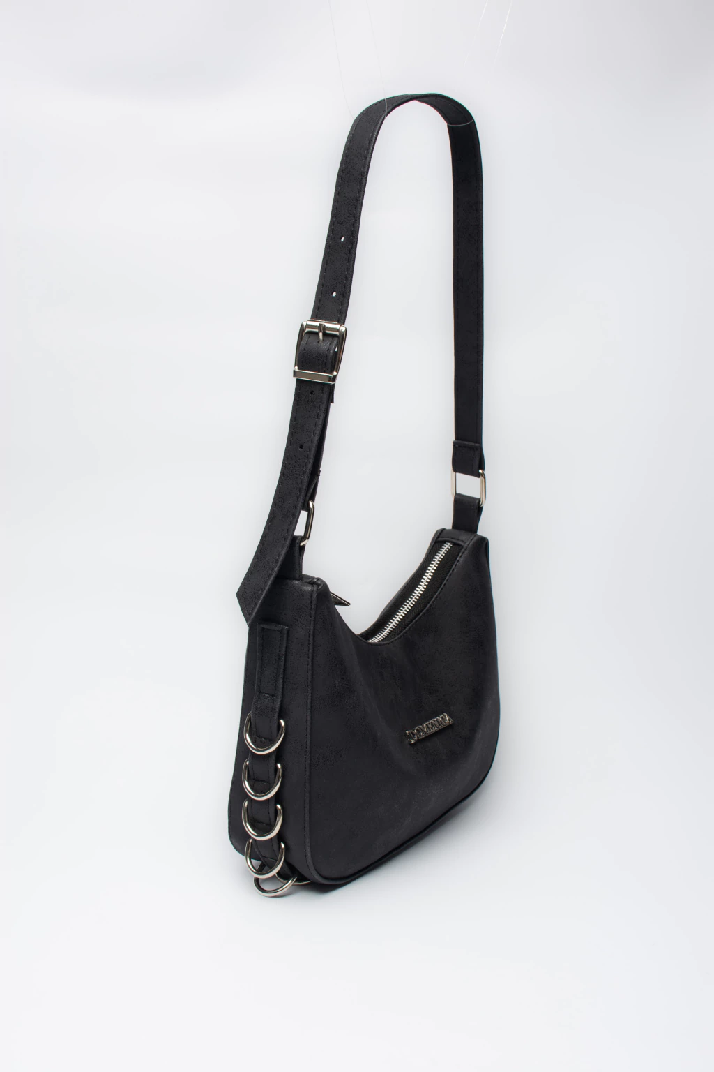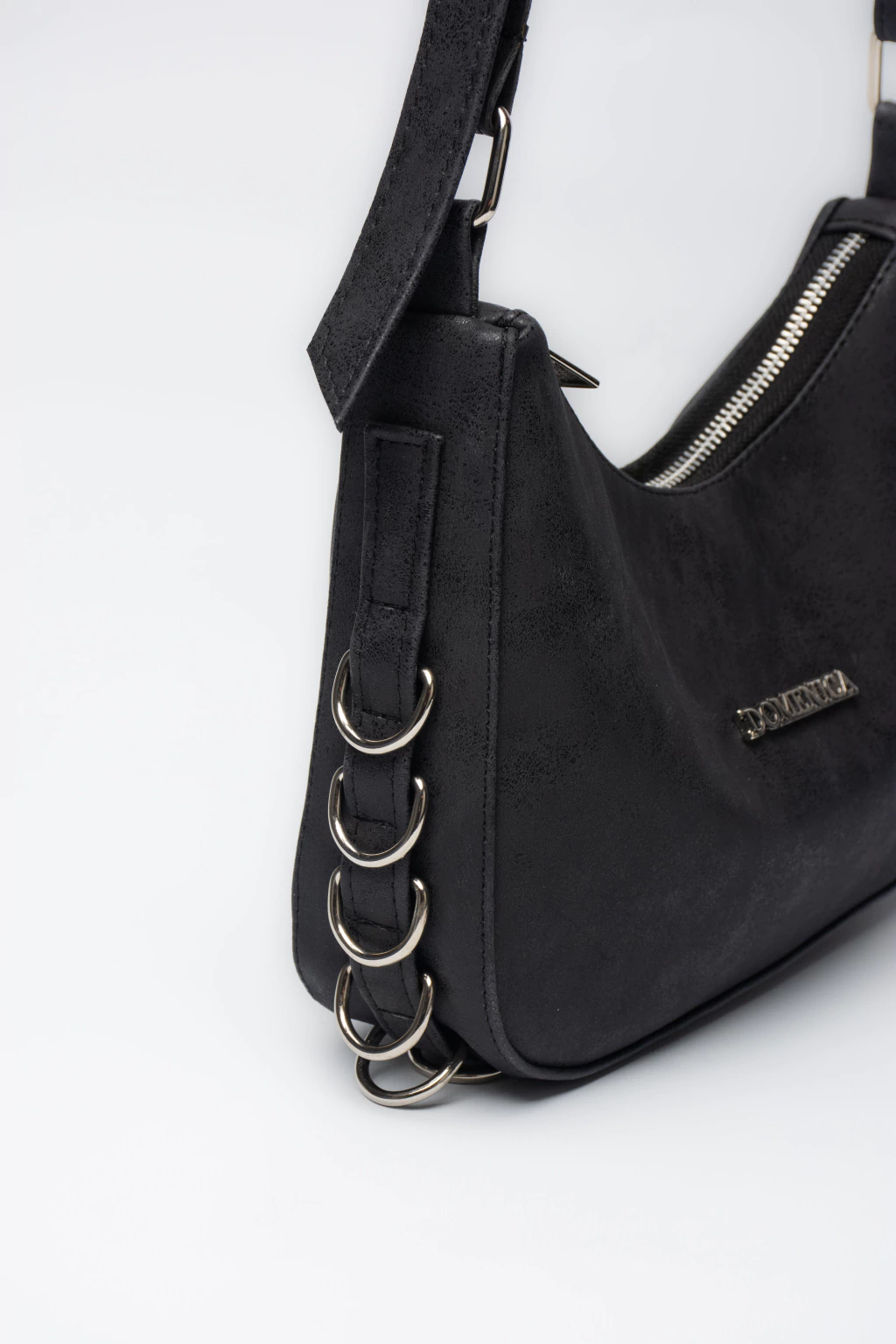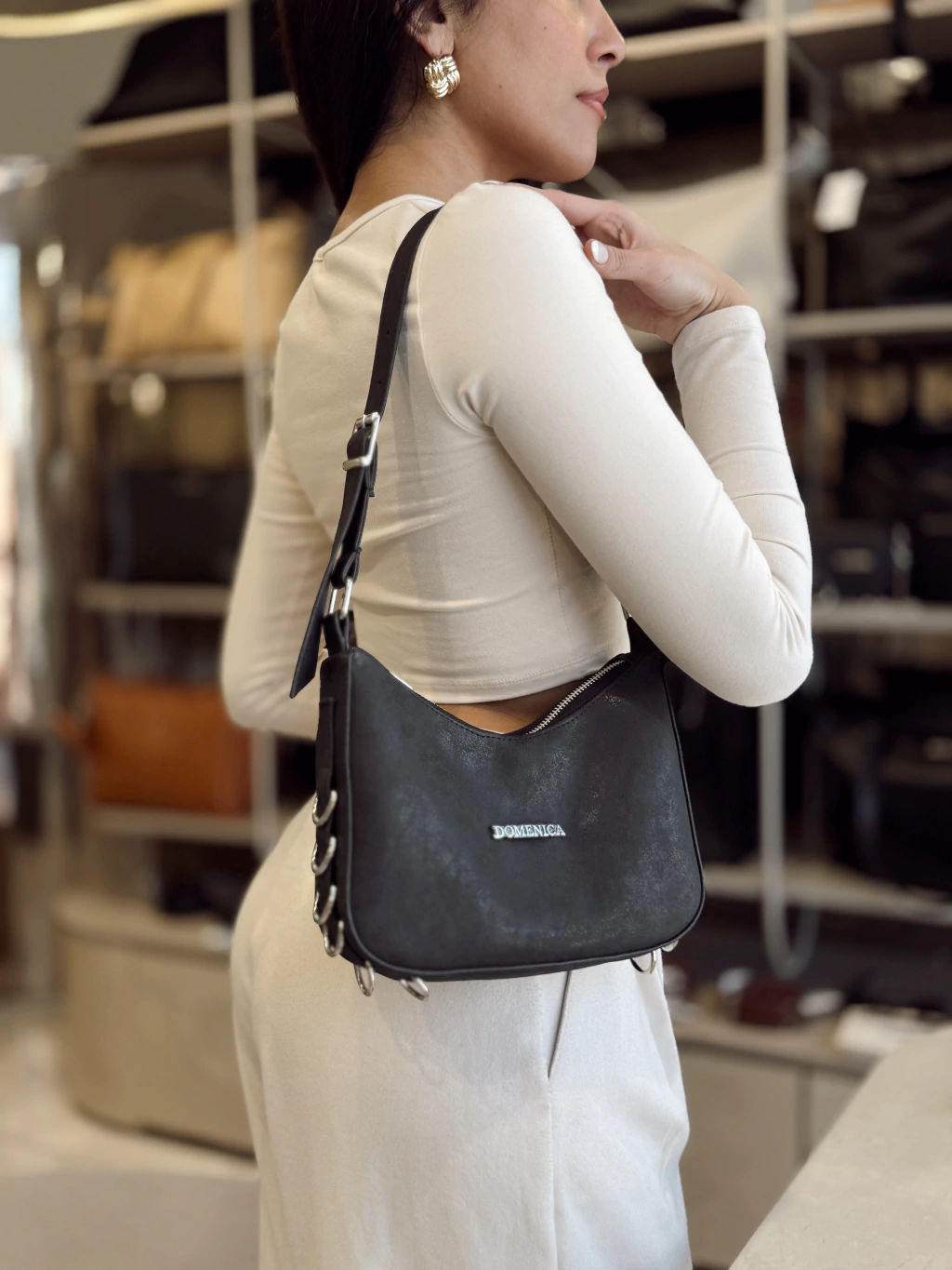 Cuenta con bolsillo interno y detalles metálicos en los laterales que aportan estilo y originalidad.