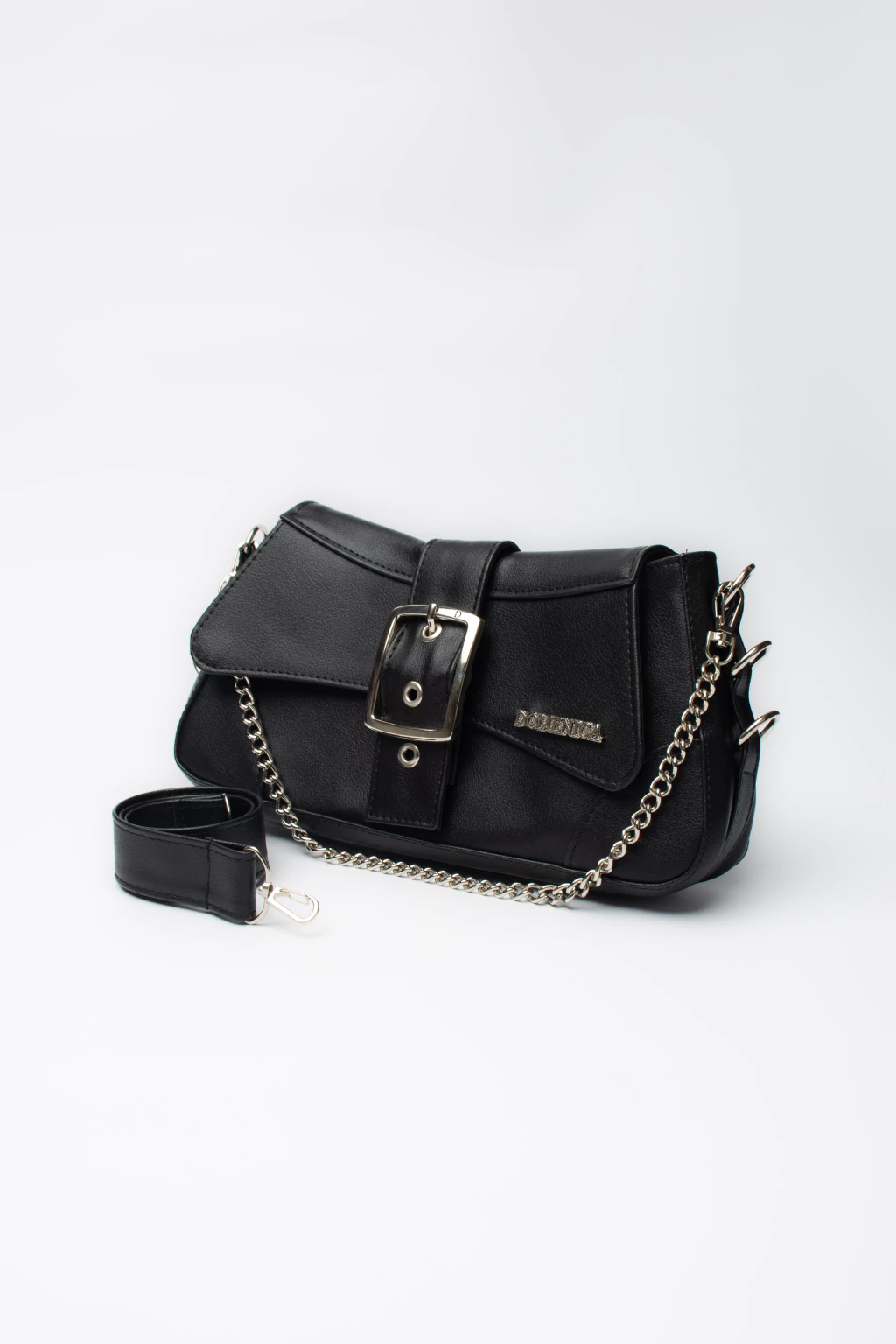Cartera rectangular rígida, moderna y canchera ,con detalle de hebilla plateada e imán en frente, tambien contiene cierre metalico.