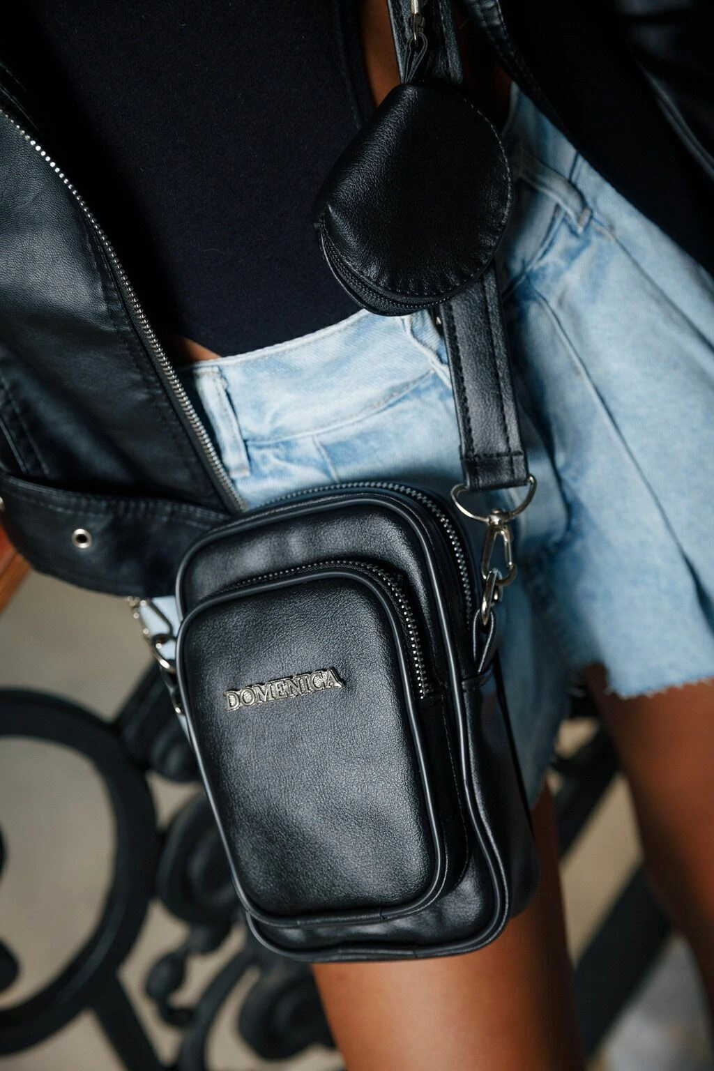 La correa mide 1.40mt y tiene un monedero circular desmontable en la misma.